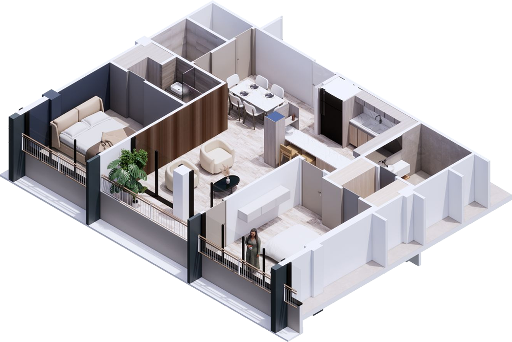 - Unidades de vivienda de 2-3 dormitorios (desde 88 m²).